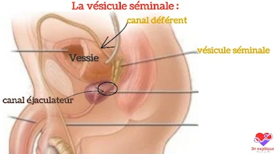 La vésicule séminale : glande paire, réservoir de spermatozoïdes, repose sur la face postérieure de la vessie. Elle élabore une grande partie du plasma séminal qui constitue le volume principal de